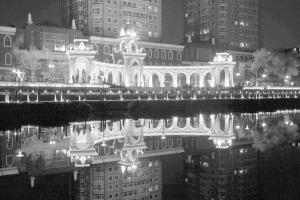 東北網9月17日電 哈爾濱市最大的濱水景觀『東方不夜城』廣場彩燈經過調試於16日全部亮了起來。每天傍晚優美的『東方不夜城』景觀都會吸引數百游人前來觀光。