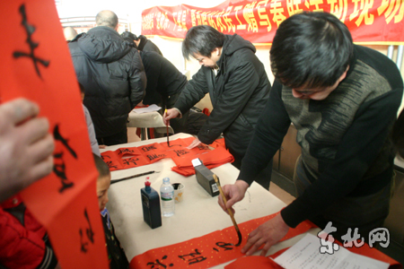 東北網2月3日電(記者 楊尚峰) 3日上午,在哈爾濱火車站候車室裡,哈爾濱鐵路局組織書法家現場為候車的農民工書寫春聯,為農民工兄弟送上一路的祝福。