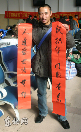 上午10點,活動剛剛開始,候車的農民工們已經紛紛排起了長隊。『這春聯是藝術品,也是鐵路對咱們的一片心意,多少錢都買不來啊!』家住肇東,從天津打工回來的時曉勝拿著春聯笑著對記者說,離開家鄉工作了一年,特別想家裡的親人,帶著這幅春聯回家,心裡別提多暖和了!