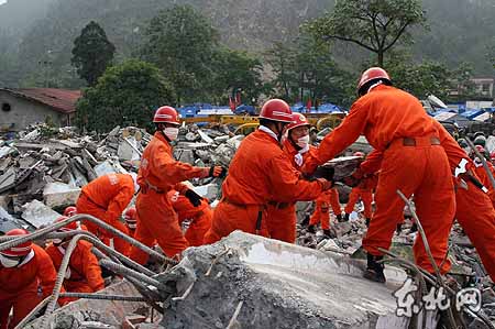 | 我省赴川救援隊隊員在北川一中救援現場進行搜救(攝影王潔實) |
