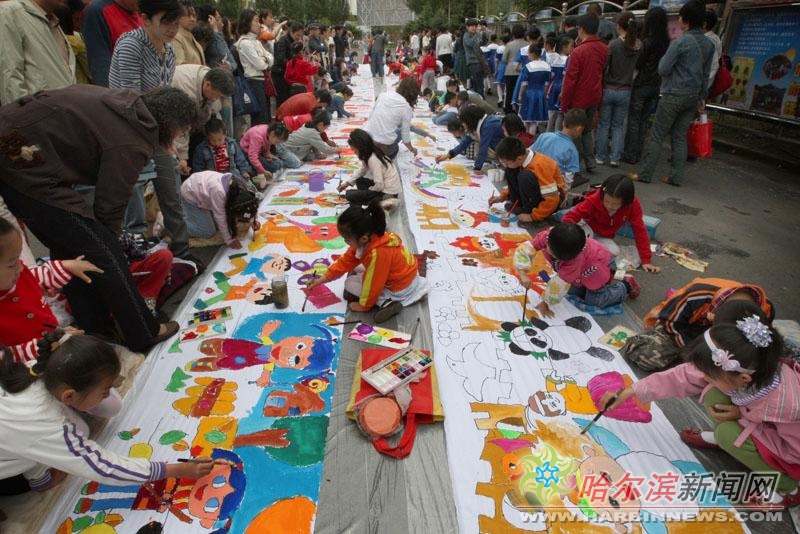 東北網6月1日訊 六一兒童節到來,昨日,在省兒少中心廣場上,兩幅長度百米的白色畫布上,來自哈爾濱市的近百名小學生正在精心的作畫,他們將對地震災區孩子的祝福,用手中的畫筆描繪出來,用自己的特殊方式為災區孩子祝福。