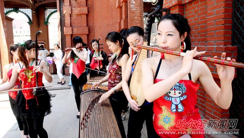 東北網7月4日訊 近日,在哈爾濱市建築藝術廣場上,身著『福娃唐裝』的9名靚麗的冰城女孩正在排練民樂。據了解,他們9名成員中有的來自哈爾濱市高校、有的已經參加工作,是一個共同的愛好民樂把她們召喚在了一起,組成了一只名為『『滿江紅女子民樂坊』』的組合,該民樂組合負責人介紹,奧運火炬即將要傳遞到冰城,她們正在排練奧運主題的民樂曲,在迎接奧運火炬時,她們將用自己手中的民樂奏響『歡迎曲』,展示民樂的無窮風采。