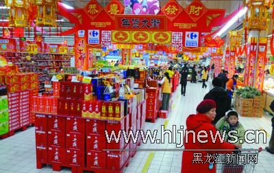 隨著春節的臨近,哈市各大商場和超市張燈結彩,不僅將店面裝飾得五彩繽紛,而且消費者所需的飲料、水果、肉菜等各類年貨更是琳琅滿目。