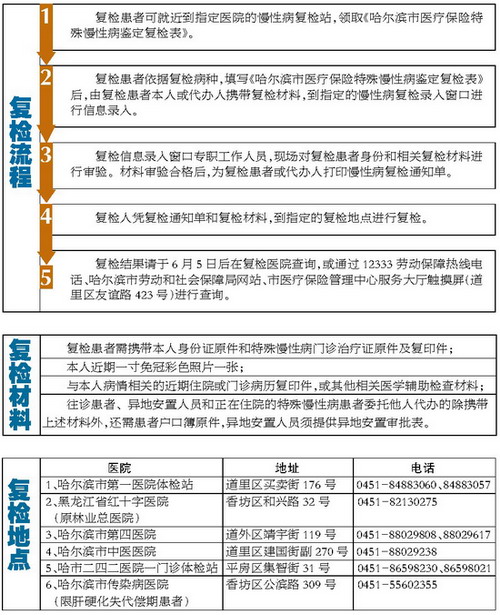 東北網5月8日訊 記者從哈爾濱市勞動和社會保障局獲悉,從11日起,哈爾濱將對2007年度參加並通過當年度特殊慢性病體檢鑒定的特殊慢性病患者展開身份認證和病情復檢。今日,哈爾濱市勞動部門公布復檢五大流程,符合條件人員須根據流程到指定的6所醫院進行復檢,復檢合格後方可繼續享受相應待遇。