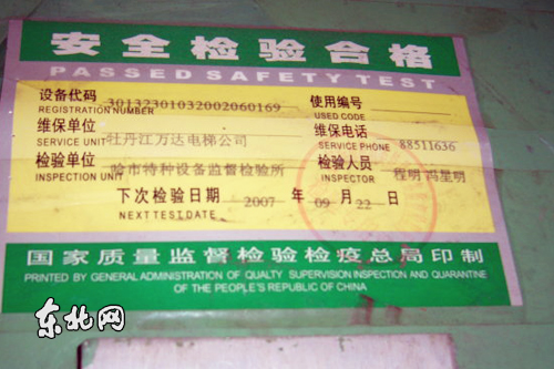 | 哈特電梯案發生後,受害人小爍(化名)家屬在出事電梯內拍攝到得該電梯的安全檢驗證書 小爍家屬提供 |