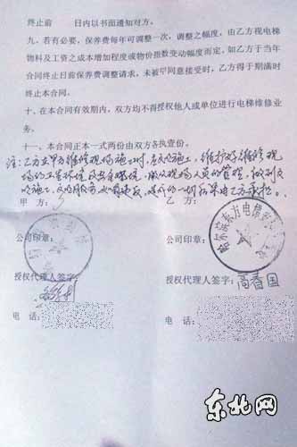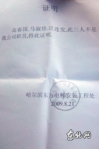 此前,記者在調查組獲悉,此案涉及的電梯維保方為『哈爾濱東方電梯工程處』。但是哈爾濱東方電梯工程處法人孫鳳軍向記者表示,與哈特商場簽訂維保合同的高春國並非其公司員工。孫鳳軍已於8月21日向調查組提交了證明,明確表示高春國並非哈爾濱東方電梯工程處員工,哈特方面提供的合同上面的公章也與哈爾濱東方電梯工程處公章存在多處區別。