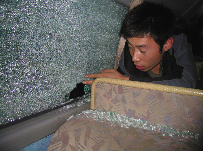 15日19時30分,記者趕到出事地點看到,被砸客車的車號為黑A86611。其前部風擋玻璃被砸,出現一個大窟窿;右側車窗部位,兩塊大風擋玻璃呈現出碎裂後的雪花狀。在車內一張靠近車窗的臥鋪上,滿是碎玻璃,該車乘客仍滯留在車上。