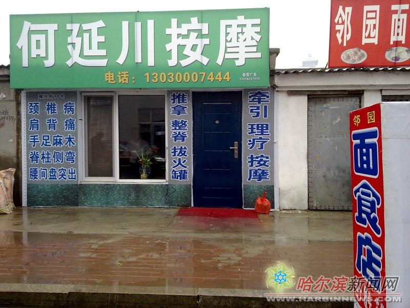 據張先生講,這家按摩院位於阿城區振興街上,是國慶節期間改換牌匾名稱為『何延川按摩店』的。