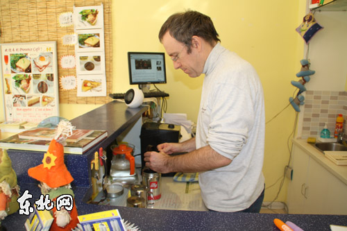 在哈爾濱定居後,菲利一直在哈工大做法語老師。但是,半年前他決定自己開一家咖啡廳,於是辭去了原來的工作。為什麼要辭職呢?當老板開咖啡廳和做老師也不衝突阿。很多朋友都這麼問他。但是菲利搖搖頭說:『其實我很喜歡當老師,離開我的學生我也很難過。但是做事情不能分心。如果要想做好這份事業,必須全身心的投入。只有這樣纔能把事做好。我要對得起我的學生,也要對得起我的客人。『普羅旺斯咖啡廳』是菲力給咖啡廳起的名字,聽起來浪漫、甜蜜。整間咖啡廳的風格都是他自己設計的,沒有誇張的色彩,隨處可見他從法國帶來的飾物,朴素溫馨得更像是他的家。咖啡廳雖然纔開業半年,卻已名聲遠揚。因為這裡的環境充滿法國田園風情,食物都是正宗的法國口味,菲利既是老板又是服務員,還是名副其實的廚師。菲力可以烹調很多美食:土司、法式煎餅、巧克力蛋糕、沙拉都是他的拿手菜。他介紹說,這些都是法國普通人家裡經常吃到的食物,就像中國的家常菜一樣,雖然沒有法式大餐的奢華,卻是原汁原味的法國風味。他笑著說:『總有人問我什麼是「法式大餐」,我只能說不是所有法國人都會做法式大餐,法國人也不是每天都吃法國大餐的。』菲力說:『我想給哈爾濱人另一種生活方式,因為我看到大家平時工作都太累,壓力太大。我想讓人們來咖啡廳坐坐,喝杯咖啡,吃塊蛋糕,放松心情,享受生活,而且咖啡廳也可以給人們提供一個了解法國文化的窗口。我有空時會開個小沙龍,給大家講講法國人的生活、旅游、文化方面的事情。』