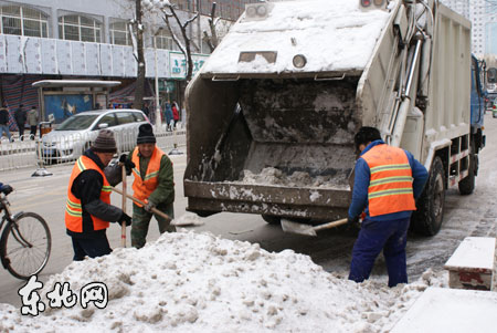 15日,南崗區城管局環衛工人正在緊張清運積雪。東北網記者高雷 攝