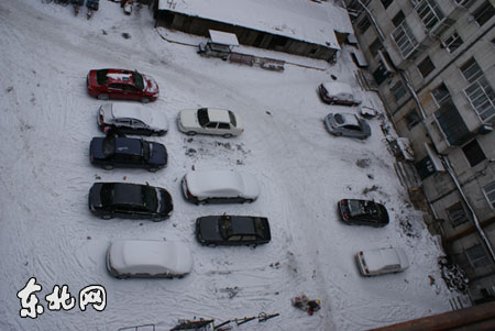 15日中午,在哈爾濱市南崗區某居民大院內鳥矙,12輛私家車中至少有5輛在降雪後沒有出行過。東北網記者高雷 攝