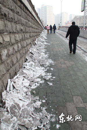 於大爺清掃過的人行橋面不再滑溜難走。東北網記者 高雷 攝 |