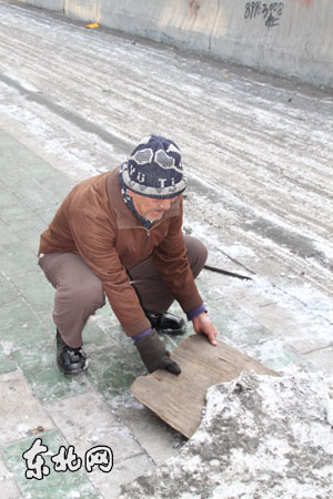 22日中午,記者在采訪的路上偶然遇到了他,當時他正在埋頭清除由極樂寺通往大方裡的人行過道橋上的積雪。於大爺以前是在松花江上開船的,退休之後總琢磨著弄點什麼事乾。他看到家附近的道橋冬天總是有積雪,雪滑坡陡行人行走不便,就從去年開始義務清掃。於大爺說,今天他早上5點多就起床了,除了中間吃飯和短暫休息,其他的時間都在清掃附近的冰雪。他這樣做家裡人也都很支持。