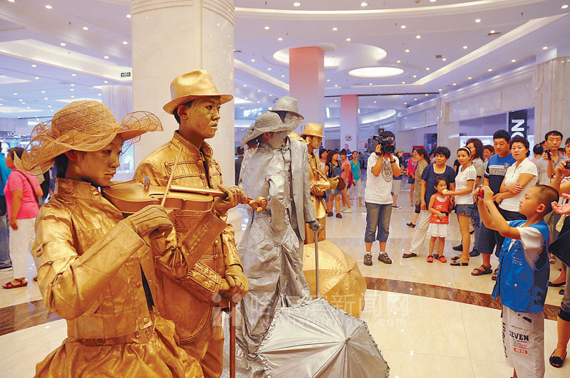 當天16時30分開始,酒吧音樂會吸引了眾多市民的腳步,商場內的休閑區、餐飲區、陽帝酒窖等處特色活動次第展開,孩子們端起相機投入到小小攝影家比賽中,主婦們跟著名廚學習烹飪技巧,……幾乎所有參與廣場節的人群都找到了自己的樂趣。前衛的『真人雕塑』更為這份體驗注入了新奇的元素。