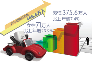 統計數據顯示,2011年黑龍江省汽車駕駛員總數達到446.6萬人,比上年增長9.7%。汽車駕駛員中,男性佔375.6萬人,比上年增長7.4%;女性佔71萬人,比上年增長23.9%,女性汽車駕駛員的增速明顯高於男性。