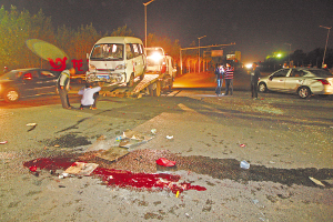 記者18時30分許趕到現場看到,事故現場處於丁字路口,路口處有信號燈,一輛車牌號為黑MB6681的白色面包車停在路中央,周圍彌漫著汽油味,其車損非常嚴重,整車風擋玻璃碎裂,車門兩側向內凹陷,前保險杠已撞癟,前左側車門有一大攤血跡,車內塑料內飾已被崩碎,方向盤也向右偏離,油箱和水箱已被撞碎,防凍液灑了一地。離面包車幾米遠的地方停了一輛銀灰色尼桑轎車,尼桑轎車沒有車牌號,其車兩側車門向內凹陷,最深處達20餘厘米,前左側風擋玻璃碎裂,全車也有不同程度的磨損,兩車周圍幾十平方米內布滿玻璃碎片。