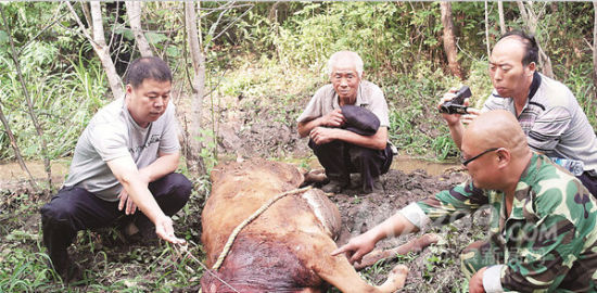 “真的很慘,剛下過雨的泥地裡,都是掙紮的痕跡。牛脖子上至少有十餘個小手指深的咬痕,腸子散了一地。”樺南野生動物保護科工作人員代雨仙趕到現場時,被眼前的一幕驚呆了。他告訴記者:“這頭牛死之前一定經過了一番搏斗。”