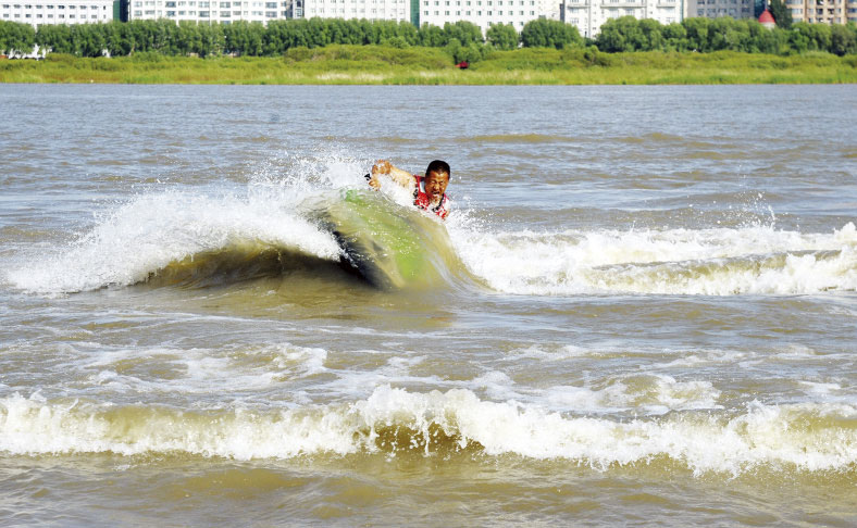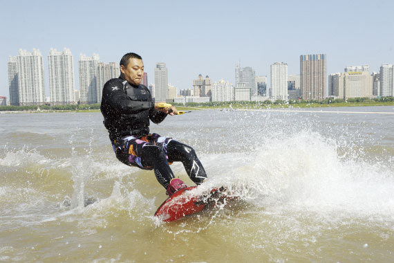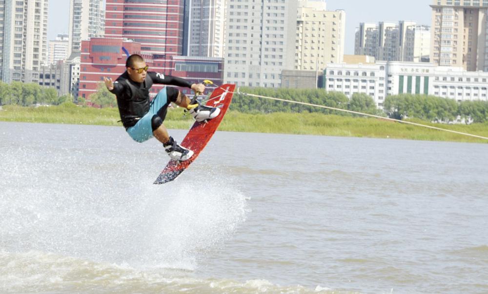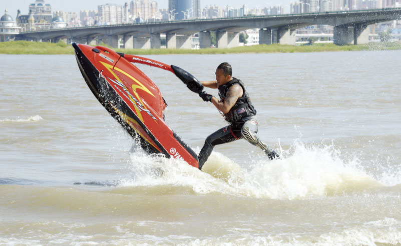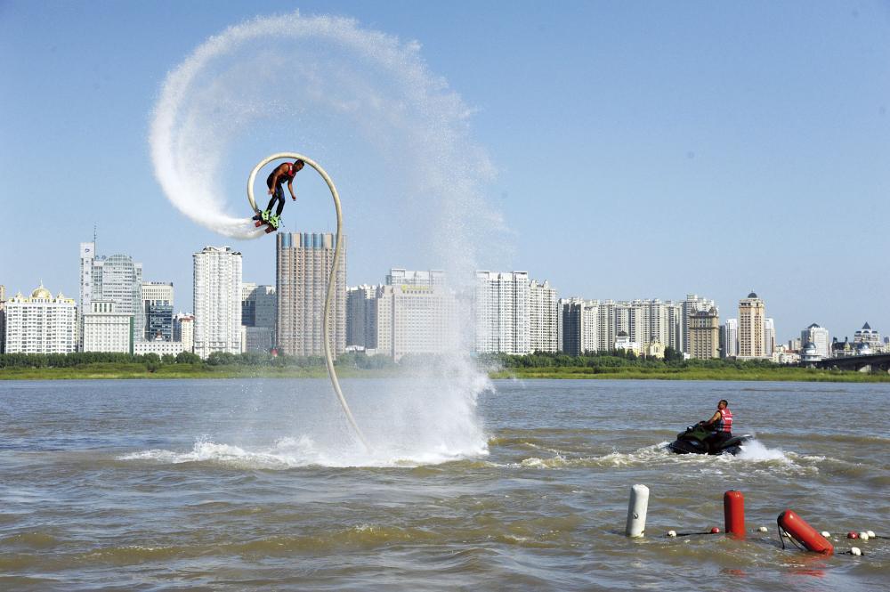 近日,記者帶著好奇,來到位於松花江哈爾濱段北岸的一處摩托艇訓練場。不知是誰喊了一嗓子,“快看那邊,一艘摩托艇鑽水裡了。”一問纔知,是47歲的熊志強駕駛傳奇摩托艇在表演漂移。在他的駕駛下,這艘艇靈活得像個轉輪,他能在十幾平方米的水域旋轉360度,而且能讓快艇紮進水裡,再從浪花中衝出,完成高難度的水上漂移動作。幾分鍾的表演結束後,熊志強又和來自廣東湛江的23歲小伙姚茂盛一起表演水上飛行。只見姚茂盛腳穿一雙連接水管的踏板,一會兒直衝雲霄,一會兒前後翻滾。姚茂盛說,他從2012年開始學習玩這種水上飛行器,首先需要的是膽量和勇氣,在水面上最高能飛起十多米高。