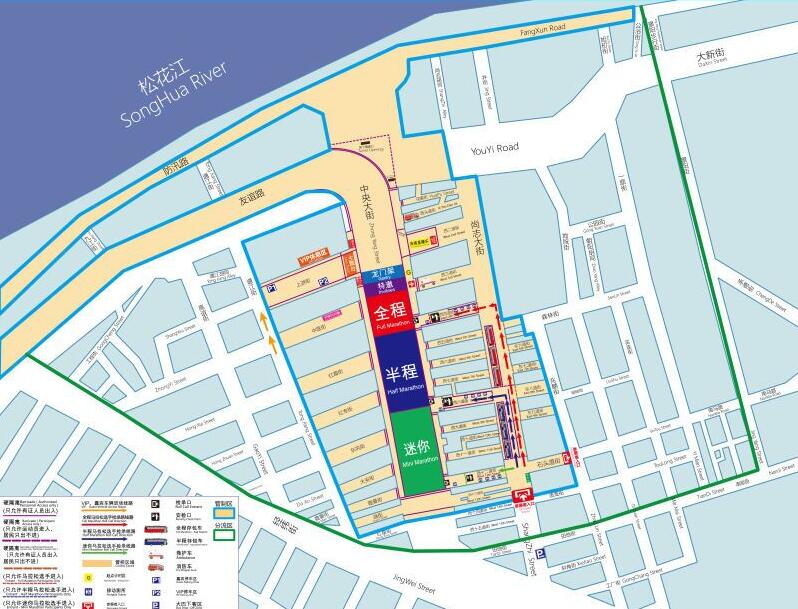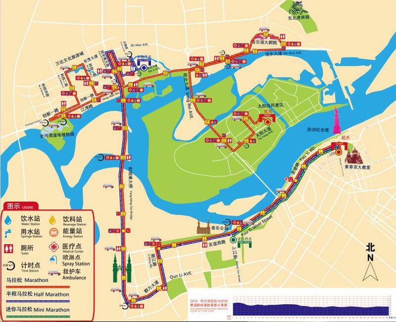 (二)半程馬拉松賽(21.0975公裡):中央大街、友誼路、友誼西路、麗江路、群力大道、陽明灘大橋、祥安南大街(右轉折返至東側輔路)、世紀大道、天翔街(折返)、世紀大道、市政府廣場(終點)。