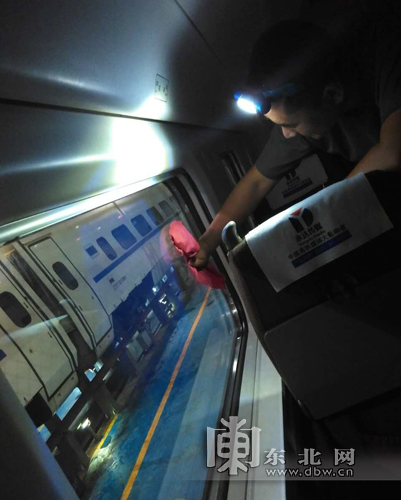 保潔人員正在頭燈的“幫助”下擦拭車窗。東北網記者 孫英鑫 攝