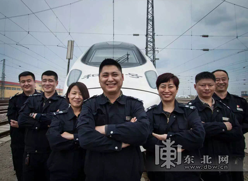 部分車輛保潔人員在動車前合影。東北網記者 孫英鑫 攝