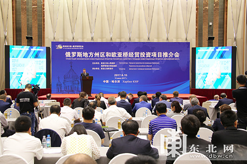東北網6月15日訊(記者 安澤)由黑龍江省人民政府和俄地方州區政府共同舉辦的俄羅斯地方州區和歐亞橋經貿投資項目推介會於6月15日上午10時在華旗禮堂召開,中俄雙方實業界代表將近400人參會,副省長郝會龍到會並致辭。