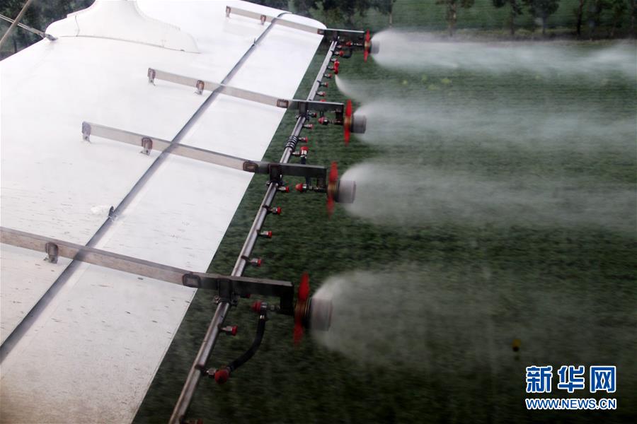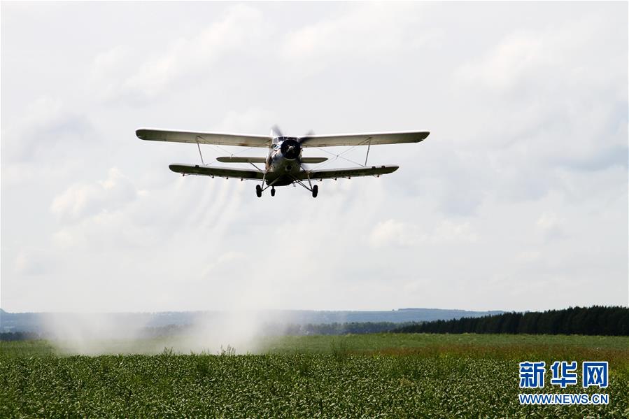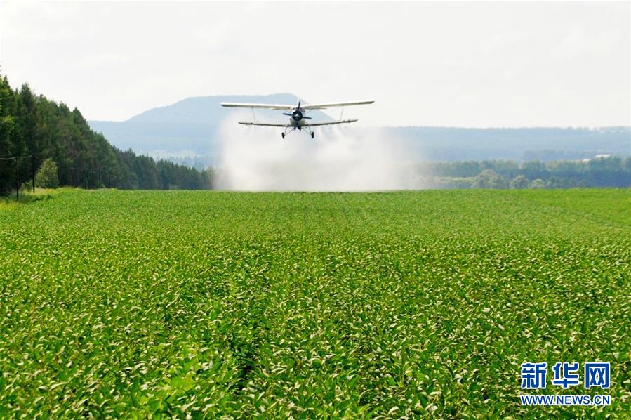 新華網黑河8月15日電 8月15日,飛機在黑龍江省黑河市五大連池農場為大田作物噴施營養液。
