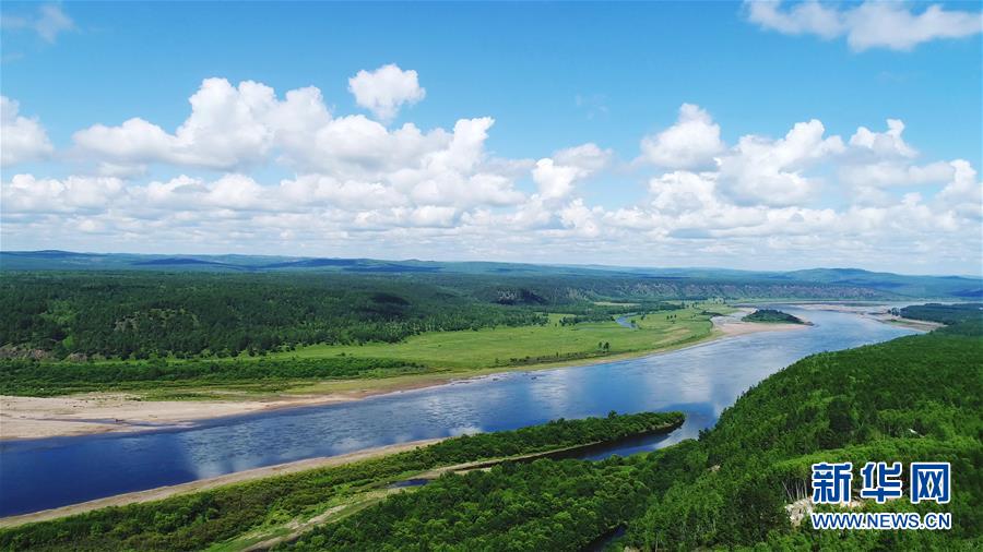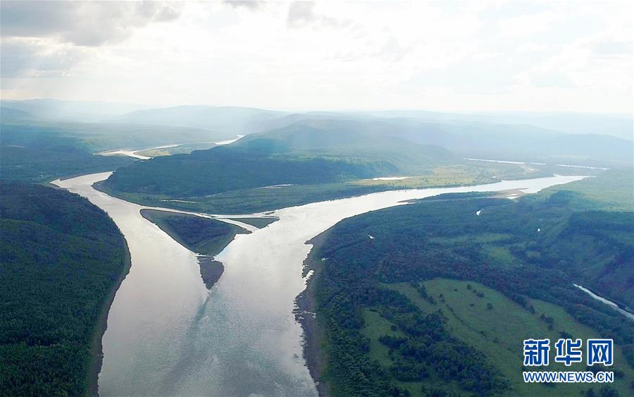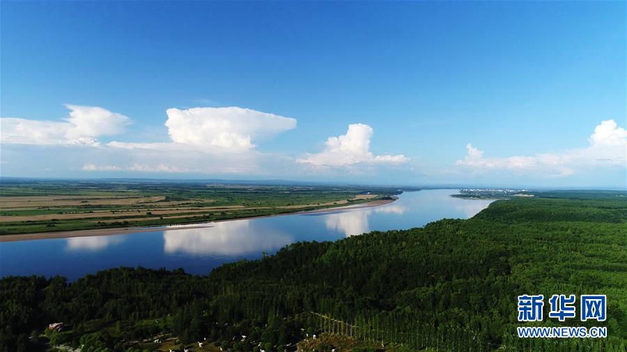 這是航拍黑龍江省伊春市嘉蔭縣黑龍江江段的景色(8月13日攝)。