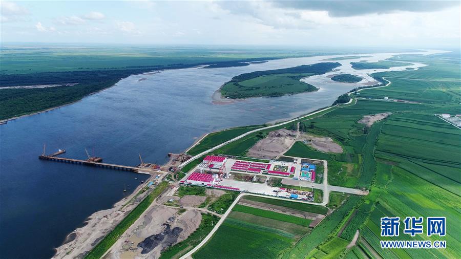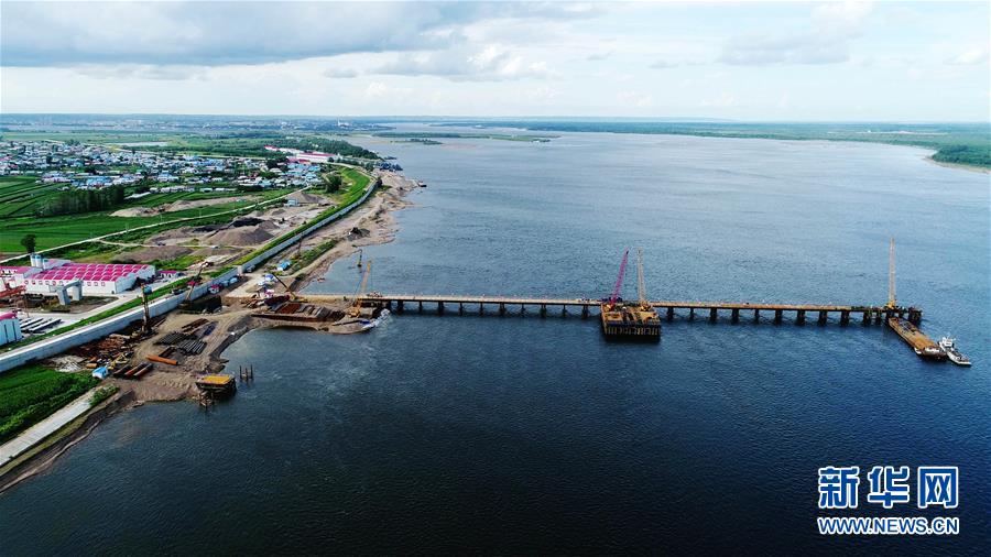 這是距呼瑪縣200餘公裡的黑龍江畔的中俄首座跨界江公路大橋的施工現場(8月10日攝)。