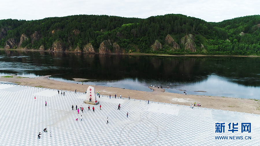 俯矙黑龍江畔北極村的神州北極廣場(8月1日攝)。
