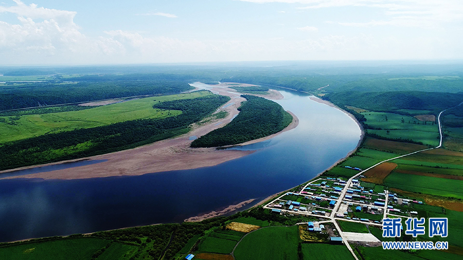 俯矙黑龍江畔的洛古河村全貌(8月1日攝)。