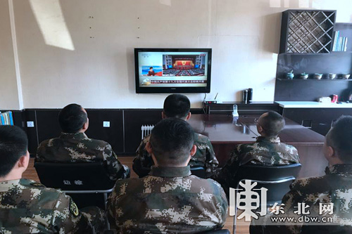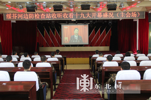 東北網10月18日訊(梁海東 記者張彩霞)18日9時,中國共產黨第十九次全國代表大會在北京人民大會堂隆重開幕。綏芬河邊防檢查站機關及執勤科備勤官兵集中收看了黨的十九大開幕會盛況。同時,在位於祖國邊陲中俄邊境線上的綏芬河邊防檢查站三號洞哨,執勤官兵們利用間隙收聽了開幕會;在綏芬河公路口岸新聯檢大樓大廳,一些等待通關的中俄游客也自發匯入了執勤官兵們的收看隊伍。