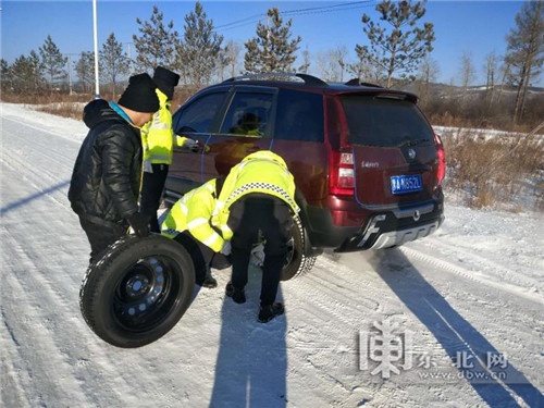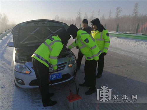 此時,車輛已經困在漠北公路上20多分鍾了,車內溫度極低,同乘的司先生朋友及其不滿3歲的孩子凍得臉色發白,身體發抖。民警立即把司先生朋友與小孩接到警車上取暖,並從巡邏車上找來警戒樁,擺在車輛後方以防事故發生。隨後,民警取出隨車攜帶的便民電瓶與電瓶線,很快幫助司機連接電瓶,成功啟動了車輛。