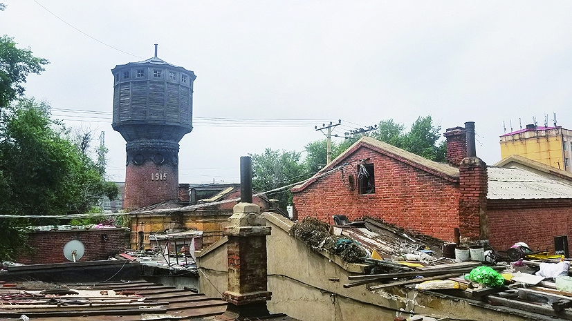 記者在距離火車站百餘米的一片棚戶區內,看到一高一矮兩座水塔立於民房之中。踏著泥濘小路,記者來到香坊區衛生二胡同,狹小的空地裡聳立著一座幾十米高的暗灰色水塔。底座是岩石,塔身是紅磚,塔頂端是木制的,有16個角,頂端有個水桶形狀的『大櫃子』基本保存完整,還有小窗式的通風口。塔身上部有水泥砌的『1915』的年標,底座與附近房子已融為一體,附近堆著各種垃圾,臭氣熏天。