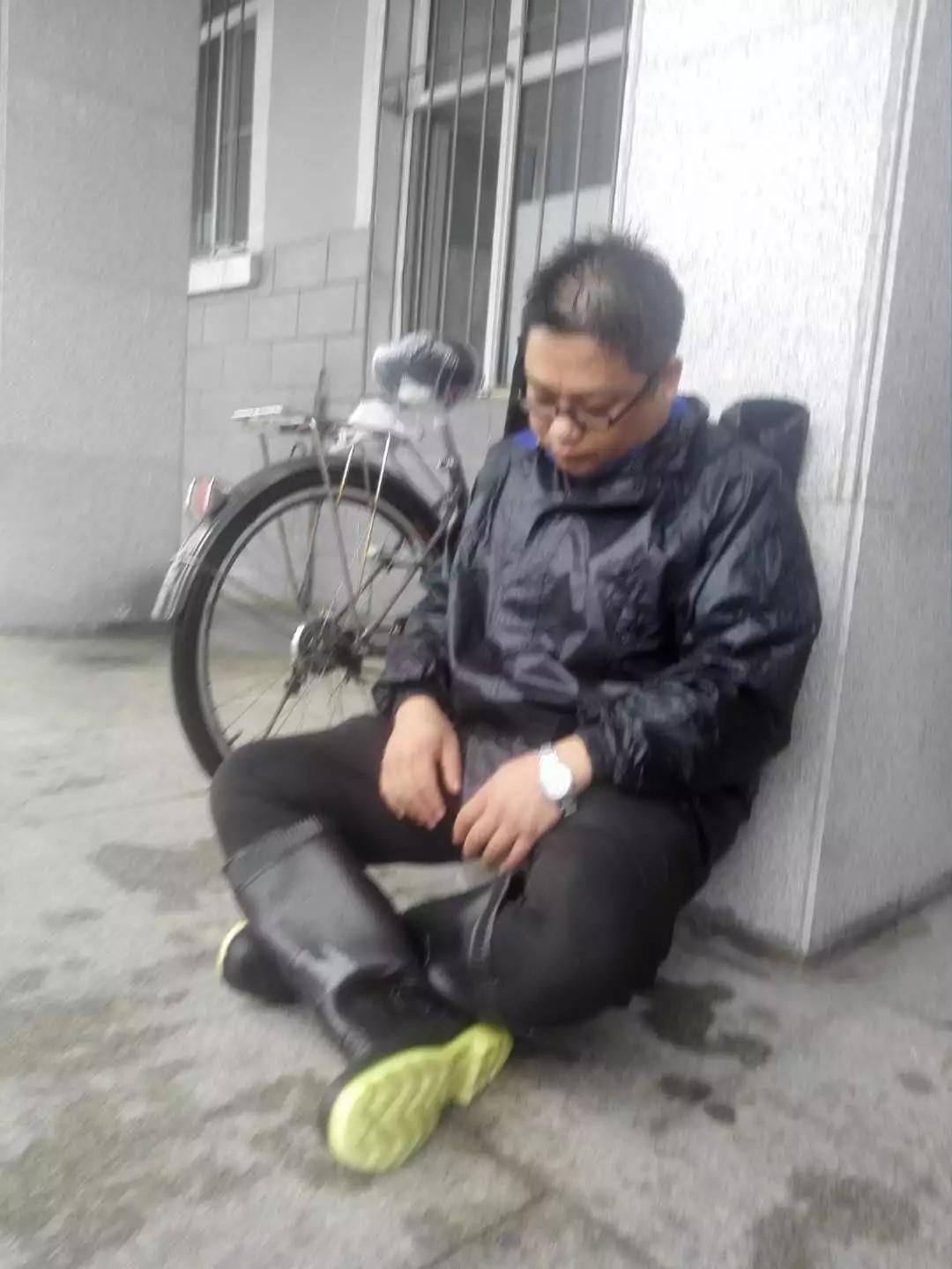 城管隊員坐在地上靠著水泥柱子睡著了。