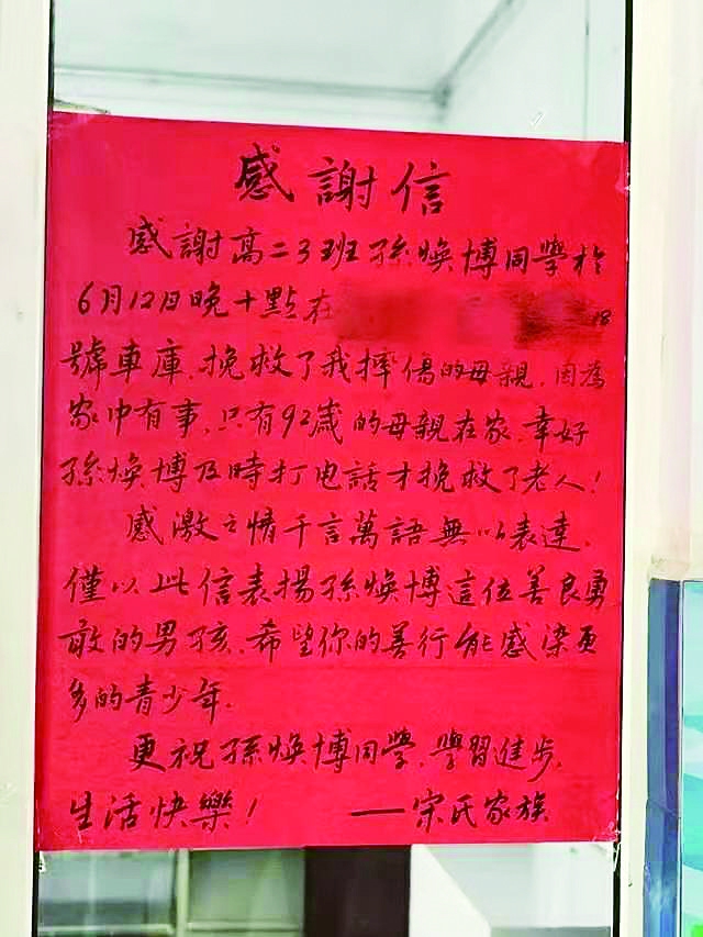 事後,孫煥博並沒有把這件事告訴家人和老師。直到老奶奶的家人到學校送來一封感謝信,感謝孫煥博的救命之恩,老師和同學纔知道他做了一件助人為樂的好事。
