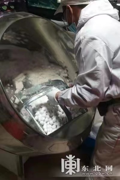 記者看到,現做現賣的元宵吸引了不少來往的顧客。銷售臺前,顧客可以直接看到元宵制作的全過程,制作人員將小方塊形狀的固體餡料放在水中快速浸濕,再扔進轉動的機器中,直到餡料裹上一層厚厚的糯米粉。浸濕和裹粉需要人工操作,反復5次,一個個圓滾滾的湯圓就做成了。 『很多年沒見到搖元宵了,由於制作比較麻煩,這些年我都到超市買袋裝湯圓。』79歲市民徐大娘說,『今天過來看到現場搖元宵的場景,就想買些回去嘗嘗。』